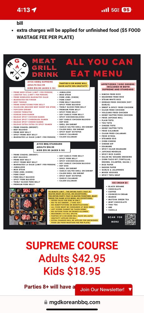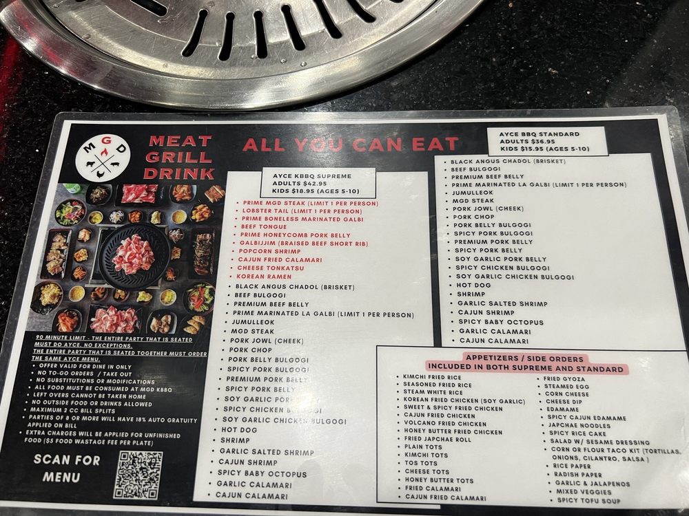 Welcome to MGD Korean BBQ, a trendy and casual spot in Los Angeles offering a wide range of Korean barbecue delights. With options for delivery, takeout, and reservations, this restaurant caters to all types of diners, including pescatarians and those with accessibility needs. The menu features mouthwatering appetizers like Fried Gyoza and Korean Fried Chicken, as well as BBQ plates such as Beef Bulgogi and Spicy Pork Bulgogi. Don't miss out on the extra sides like Kimchi and Sweet Mashed Potato Corn. Customers rave about the quality of the meats and the variety of sauces, with favorites like the bone-in La Galbi and lobster receiving high praise. While some mention minor service issues, overall, MGD Korean BBQ is a top choice for a satisfying Korean barbecue experience in the Valley. Whether you're a BBQ enthusiast or looking to try something new, this restaurant is a must-visit.